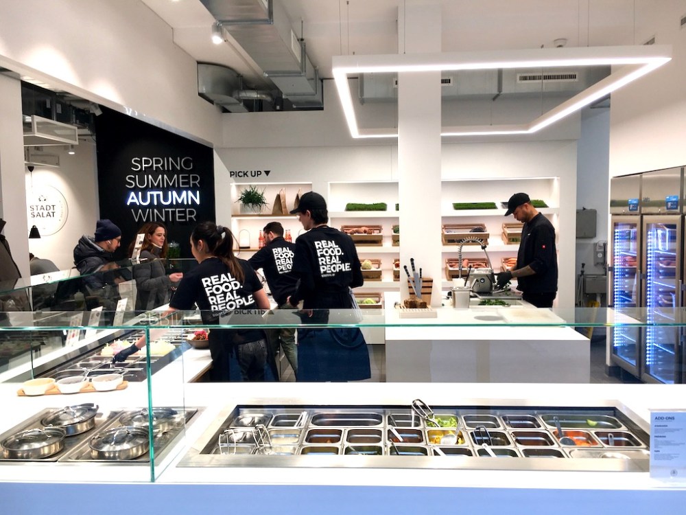 Während Stadtsalat in Hamburg bisher einzig ein Ghostrestaurant betrieben hat, wurde im Juli vergangenen Jahres in Berlin an der nördlichen Friedrichstraße erstmals auch ein Restaurant mit 50 Plätze eröffnet. Im Sommer können vor dem Lokal noch einmal 20 Gäste Patz nehmen. Die Kuriere kommen über einen separaten Hintereingang in einen Warteraum, wo sie verschnaufen und die nächsten Bestellungen in Empfang nehmen können. An allen Stationen von der Küche, über die Anrichte bis zur Ausgabe regeln detaillierte Vorgaben auf Tabletts und Monitoren die Abläufe. Welche Zutaten müssen vorgekocht werden, welches Gericht muss als nächstes zusammengestellt werden, wo sind die Fahrer und wann treffen sie wieder ein, um die nächsten Salate abzuholen. Die Rezepte für die vorzukochenden Zutaten sind in die vernetzten Konvektomaten einprogrammiert und können online angepasst werden. Die Plattform für die Warenbestellung sammelt Informationen über sämtliche Lagerbestände und berechnet mit Hilfe statistischer Daten der letzten vier Wochen, wie viele Kardamonmöhren und wie viele Filetscheiben vom Havellandrind das Küchenteam am morgen produzieren muss.