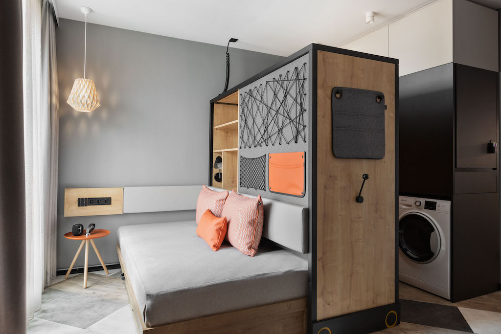 Ein bemerkenswertes Merkmal ist das Wohnelement „The Slide“, das eine flexible Nutzung des Raums ermöglicht. Gäste können den Raum je nach Bedarf anpassen, sei es für Schlaf- oder Kochmöglichkeiten.